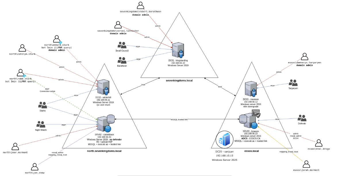 To validate BadSuccessor, I added a Windows Server 2025 domain controller into my existing AD domain (forest functional level ≥ 2016). For context - I am simply running the well-known GOAD AD template and manually adding the Windows Server 2025 machine to the domain and promoting it to a DC. This would look like this (see essos.local domain now has an extra host):
