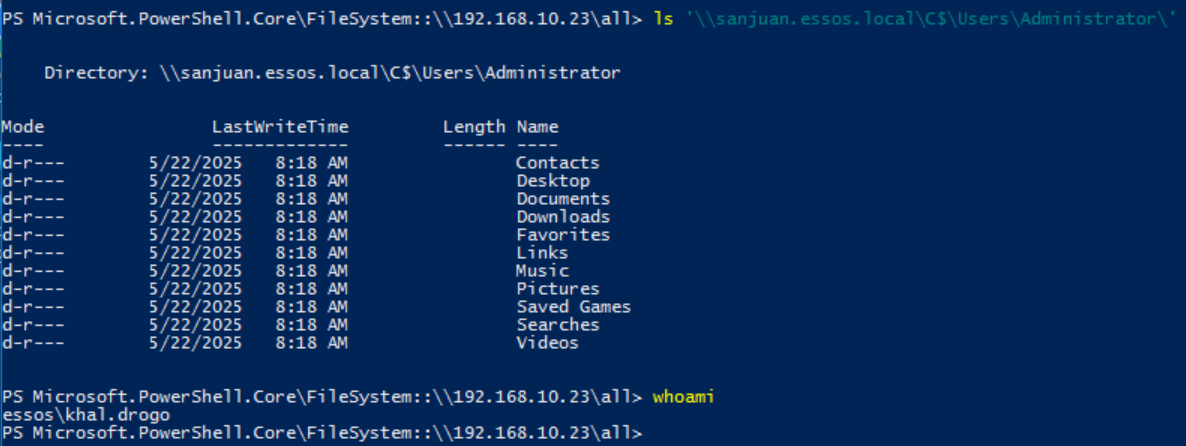 This then allows us to navigate to the C$ drive of the targeted domain controller in this case as we injected the ticket into our current session using pass-the-ticket `/ptt`. You could also just save the ticket and use it along with impacket tools or whatever post-ex tooling you want to use that accepts Kerberos auth.