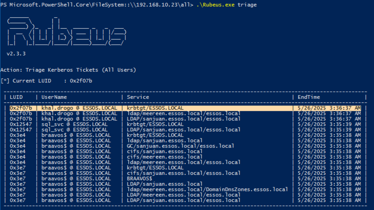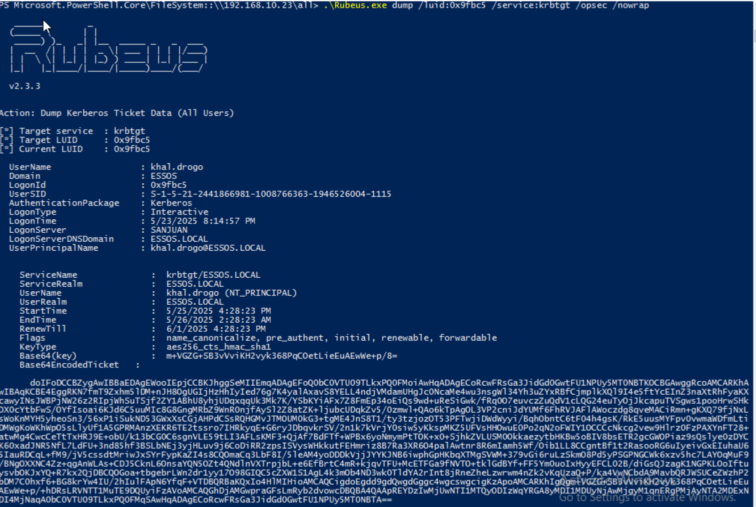 .\Rubeus.exe dump /luid:<luid> /service:krbtgt /opsec /nowrapWe want to grab the LUID associated with the machine or the user. In my case, since I set the principal to be the user khal.drogo I grab his LUID: