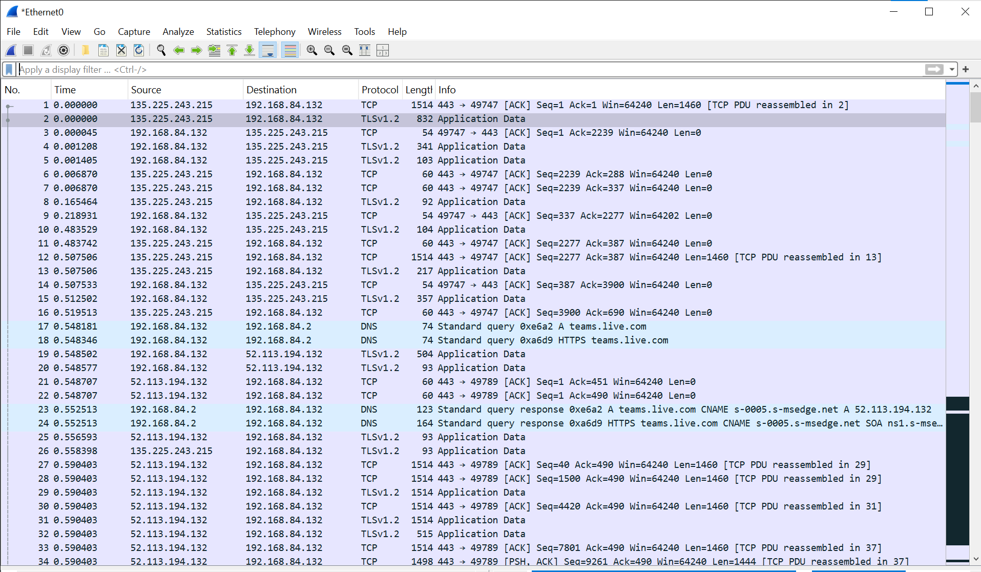 To validate whether messages were being fetched dynamically via network calls, Wireshark was used to inspect Teams' encrypted traffic.