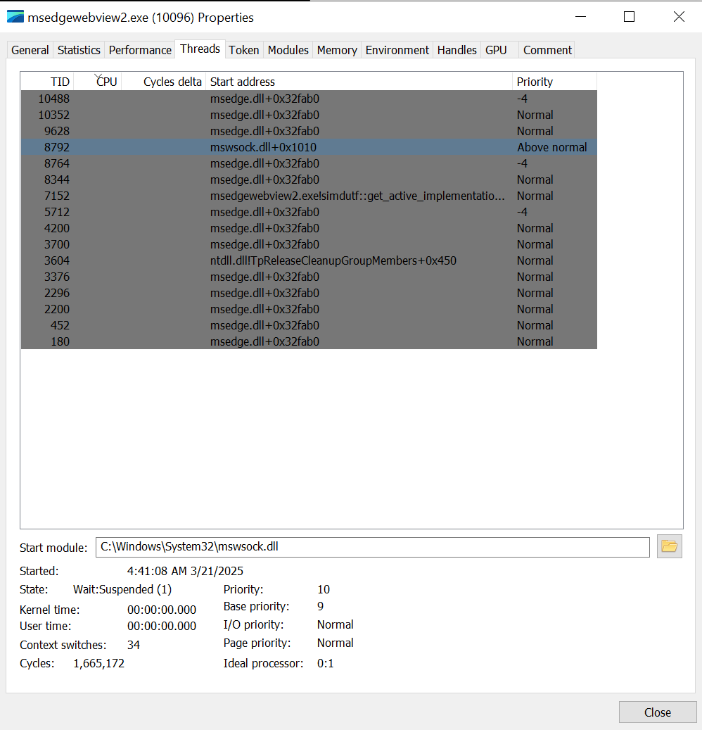 It should be noted that ms-teams.exe had multiple child processes named msedgewebview2.exe. Suspending all non-UI threads on each one returned different results in terms of how the UI behaved while suspended. There is one specific instance of the child process that is better than the others to suspend, I decided not to add logic to identify this in order to maintain the versatility of the tool to be able to target all processes. If you were going for extreme stealth or targeting a very specific component of a process, you could implement this into the BOF.