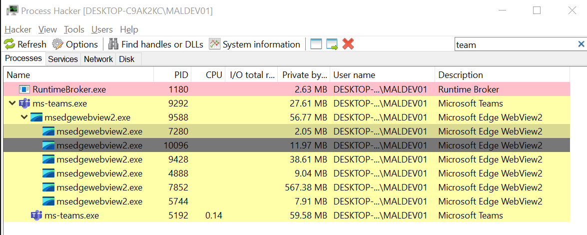 The first step was to analyze how Microsoft Teams operates at the process level. Using Process Monitor and Process Hacker, I examined the child processes spawned by ms-teams.exe.